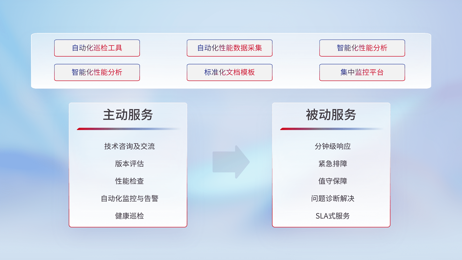 智能化工具和标准化文档,,保障服务质量,,提供主动服务(包含技术咨询、、版本评估、、性能检查、、、、自动化监控与告警、、、健康巡检)和被动服务包含(分钟级响应、、紧急排障、、、、值守保障、、、问题诊断解决、、、SLA服务)。。